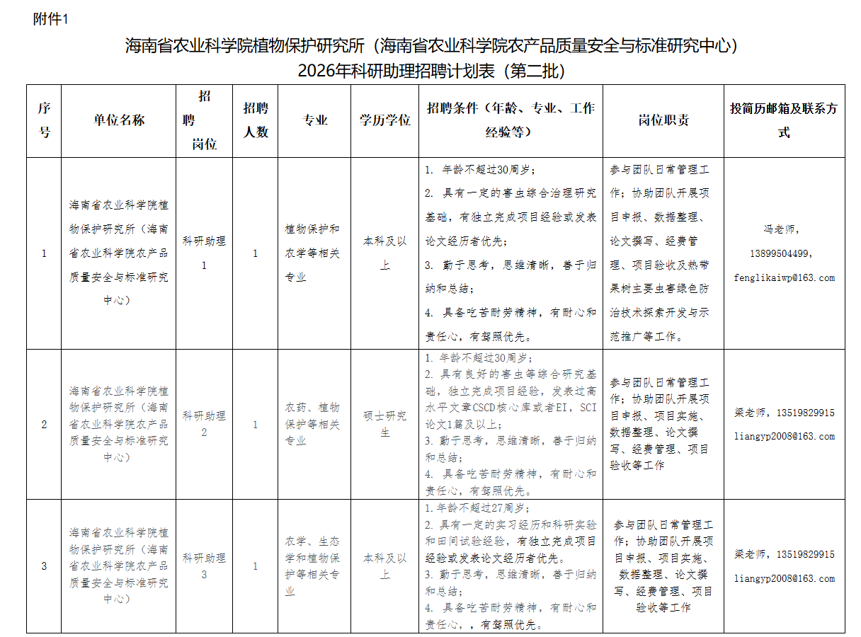 因植物保护研究所(农产品质量安全与标准研究中心)科研团队(项目)工作实际需要,根据《海南省农业科学院关于项目聘用(编外)人员聘用及管理的指导性意见》(琼农院〔2025〕12号)要求,现面向社会公开招聘科研助理人员3名。现就有关事项公告如下:
