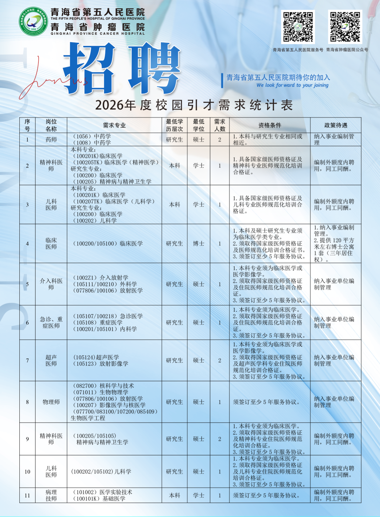 引才优惠政策:应聘人员可享受《青海省2026年度引进高校优秀应届毕业生公告》中相应省级优惠政策: