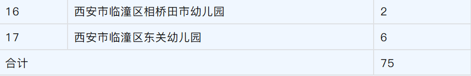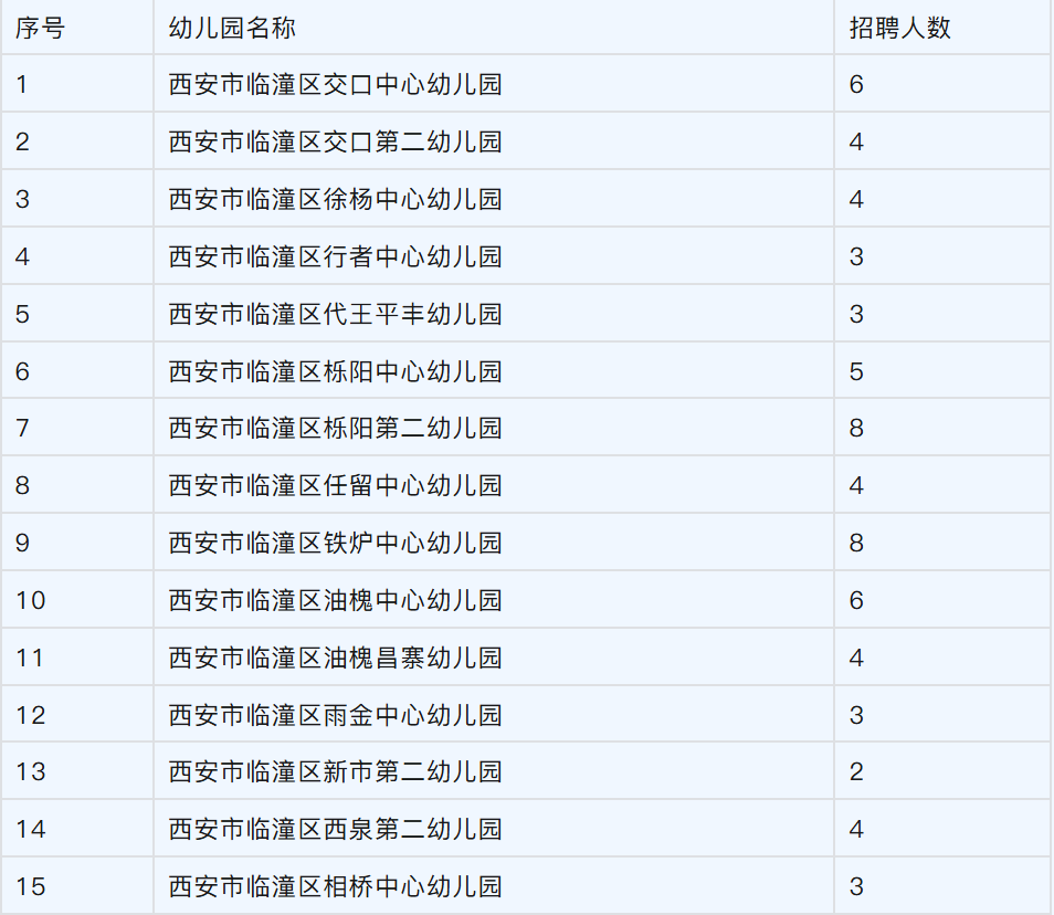 本次共招聘临聘幼儿教师75名,采用第三方劳务派遣形式,派遣至临潼区17所幼儿园工作,具体岗位及人数分配如下: