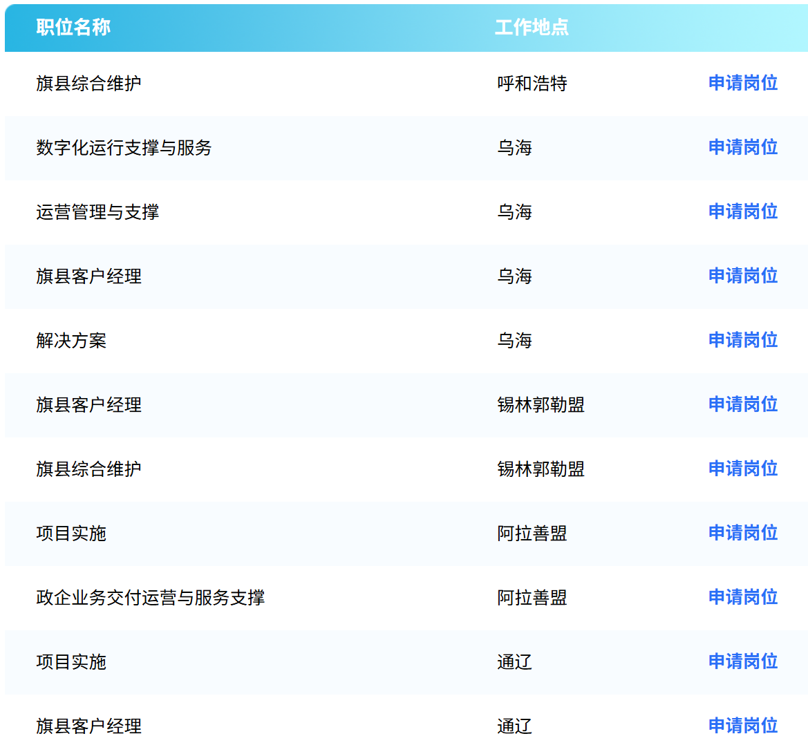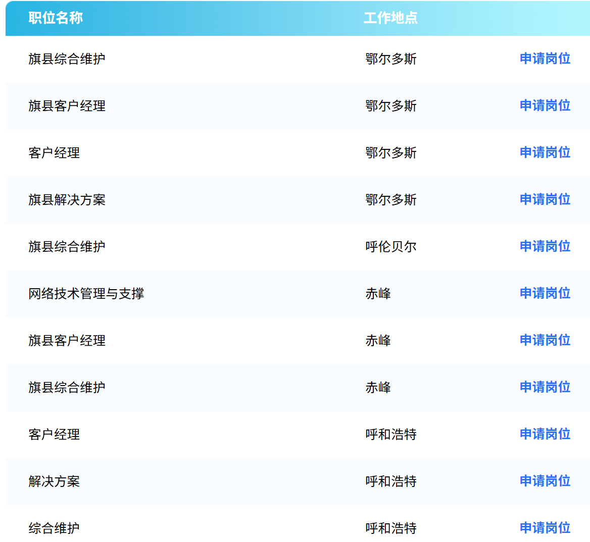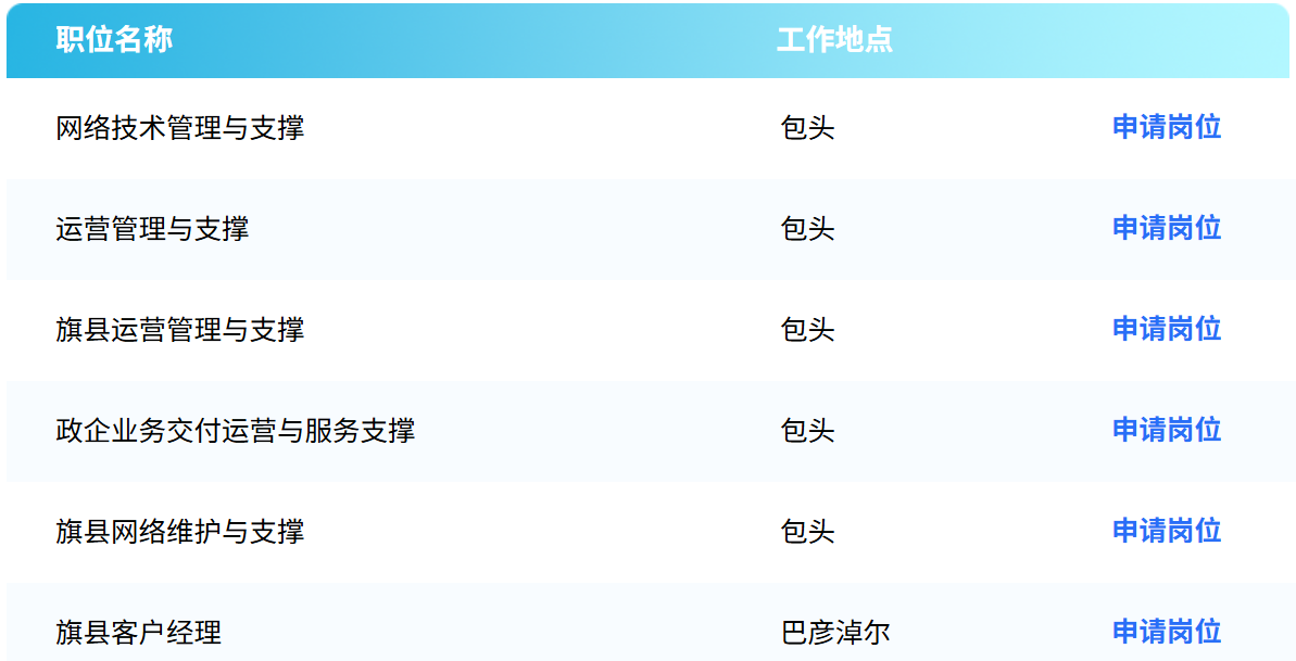 岗位:旗县综合维护、公众客户经理、解决方案、政企运营管理与职称、客户服务管理、通信工程项目管理、综合维护、旗县网络技术管理与支撑、项目实施、旗县公众运营管理与支撑、旗县网络维护与支撑、数据安全管理、通信工程项目管理等