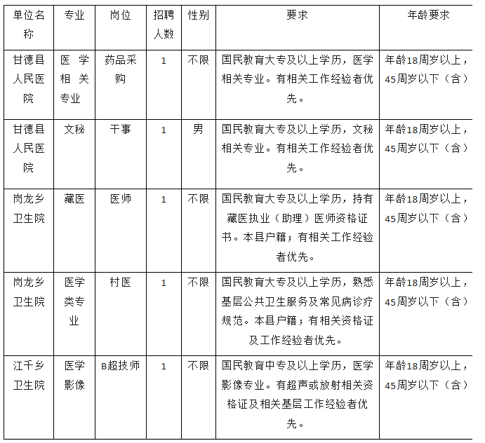 为进一步推进深化医药卫生体制改革,切实加强医疗卫生人才队伍建设,根据我县域医共体成员单位医务人员总量配备管理办法及工作实际需要,现面向全省公开招聘甘德县域医共体总院编外专业技术人员5人,现将有关事项公告如下: