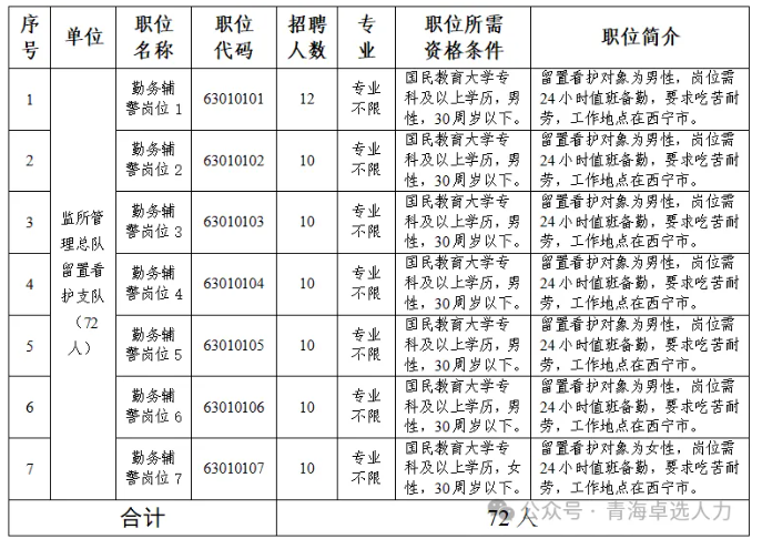 根据《青海省公安机关警务辅助人员管理条例》及相关管理办法规定,青海省公安厅决定面向社会公开招聘留置看护警务辅助人员(以下简称 “辅警”),现将有关招聘事项公告如下: