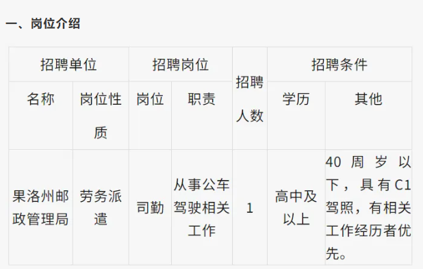 果洛州邮政管理局是中央编办批设的副县级邮政监管机构,负责全州邮政行业管理工作,履行政府监管职能,主要职责为贯彻执行国家关于邮政业管理的法律法规、方针政策和邮政服务标准;监督管理所在地区邮政市场;组织协调所在地区邮政普遍服务以及机要通信、义务兵通信、党报党刊发行、盲人读物寄递等特殊服务的实施等。根据工作需要,按照有关要求,拟公开招聘司勤共1名。现将有关事项公告如下。