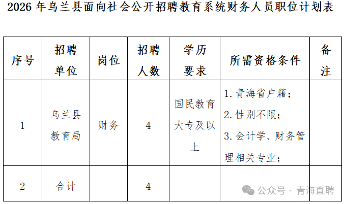 1.2026年乌兰县面向社会公开招聘教育系统财务人员职位计划表